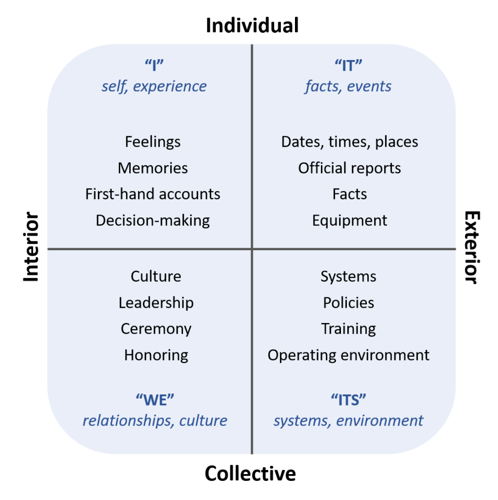 Integral analysis teaches us that a subject should be looked at through four main lenses to be fully understood: individual interior (self, experiences), collective interior (relationships, culture), individual exterior (facts, events), and collective exterior (systems, environment). This virtual museum was built to share all of these important pieces out of the deepest respect for everyone involved.
