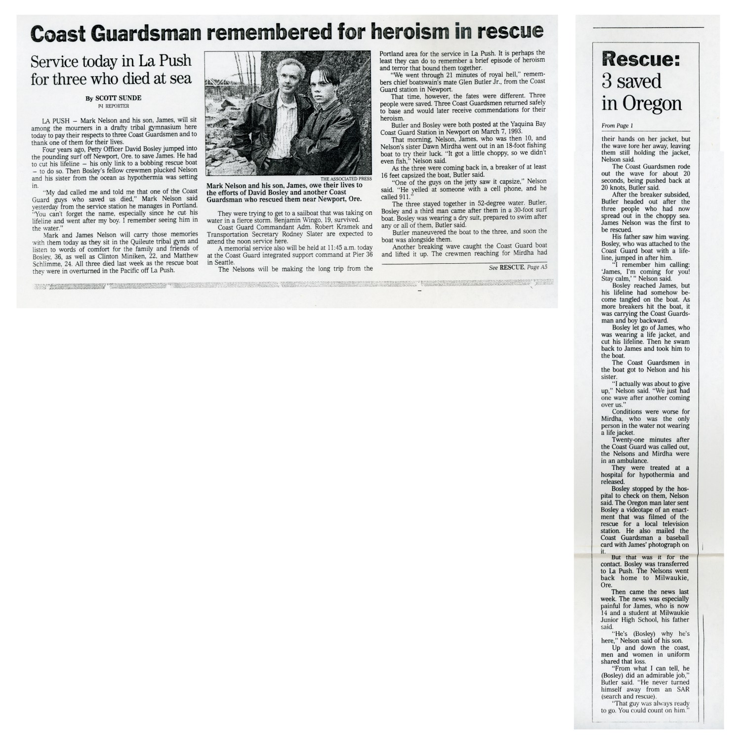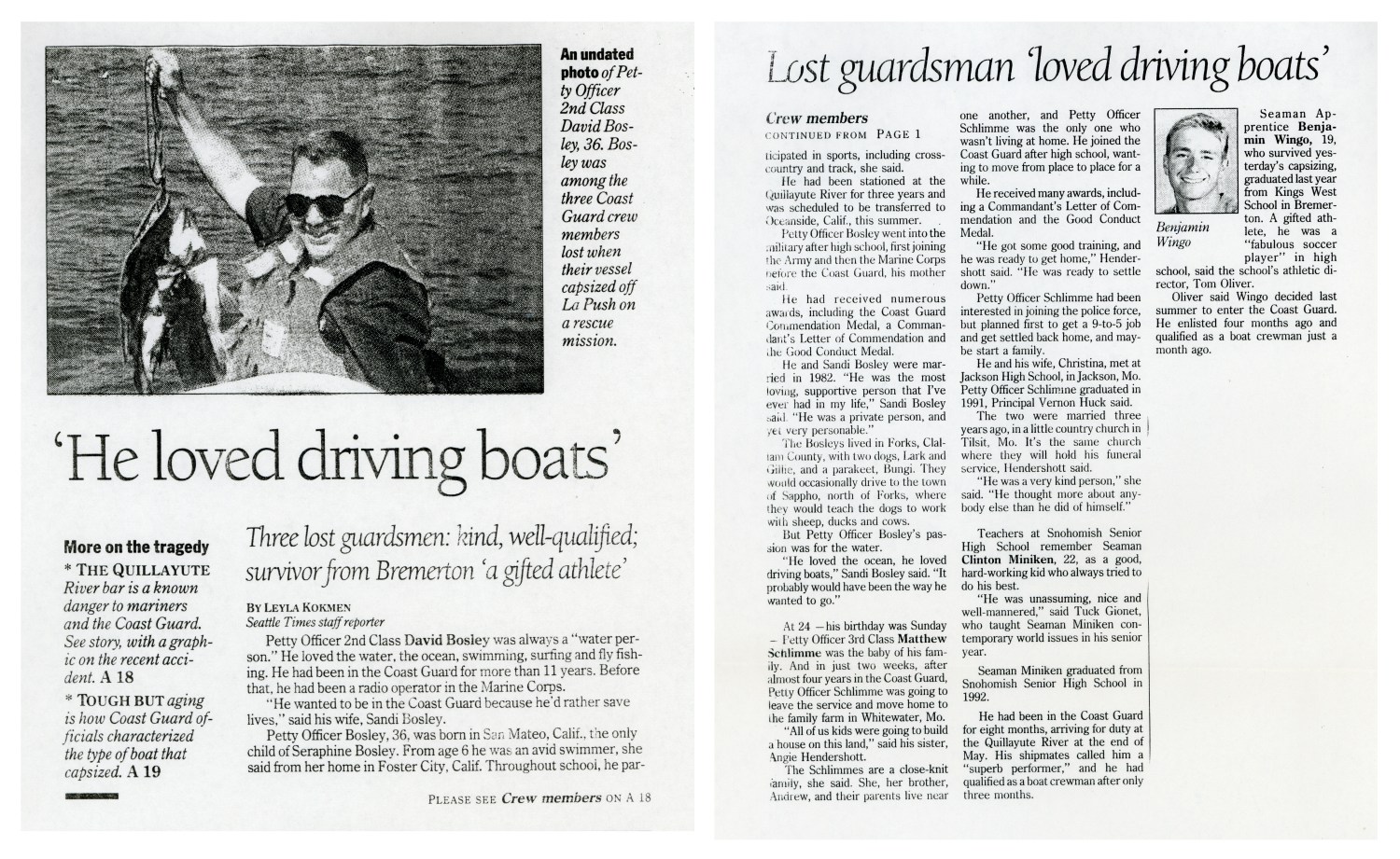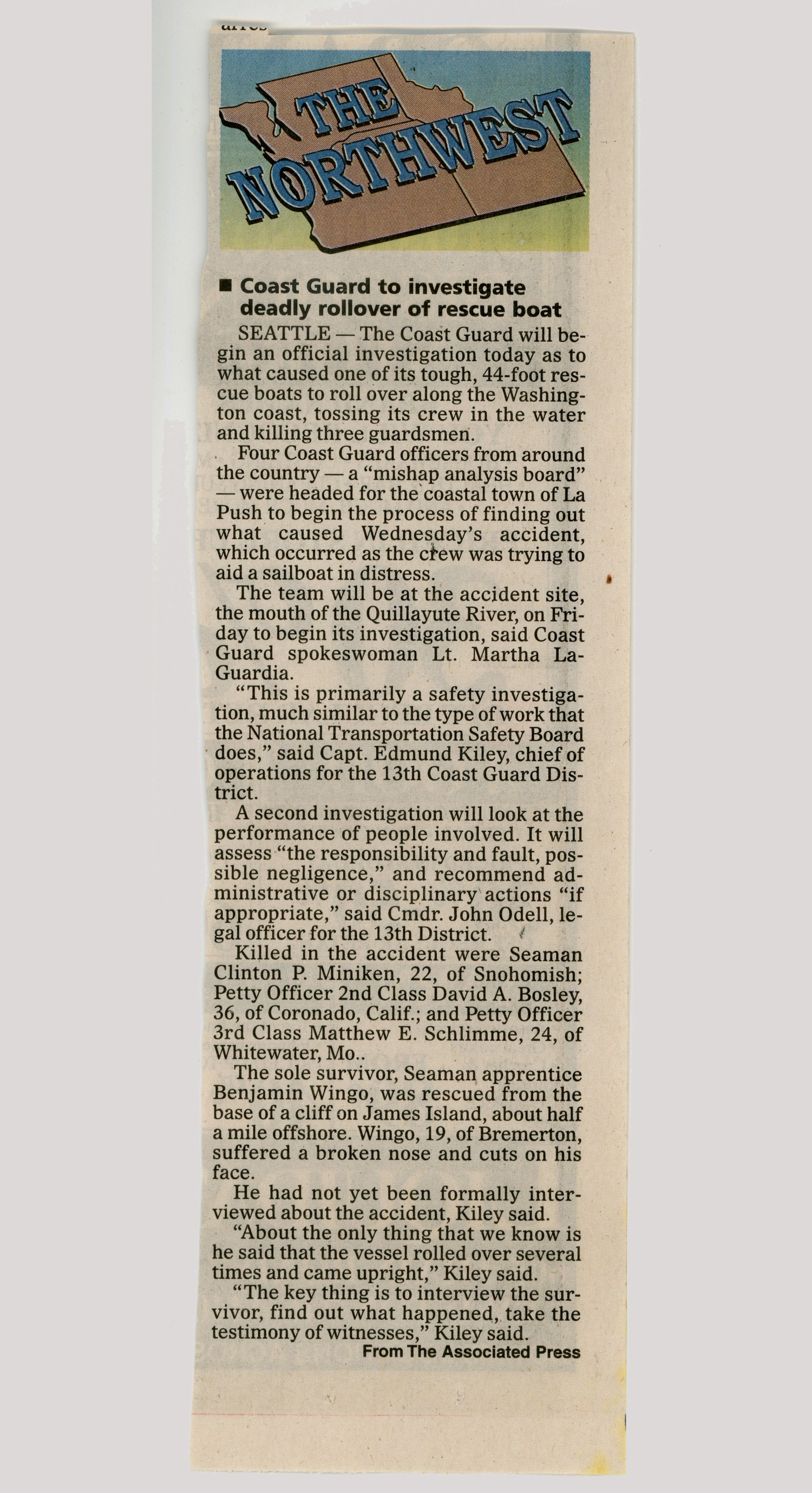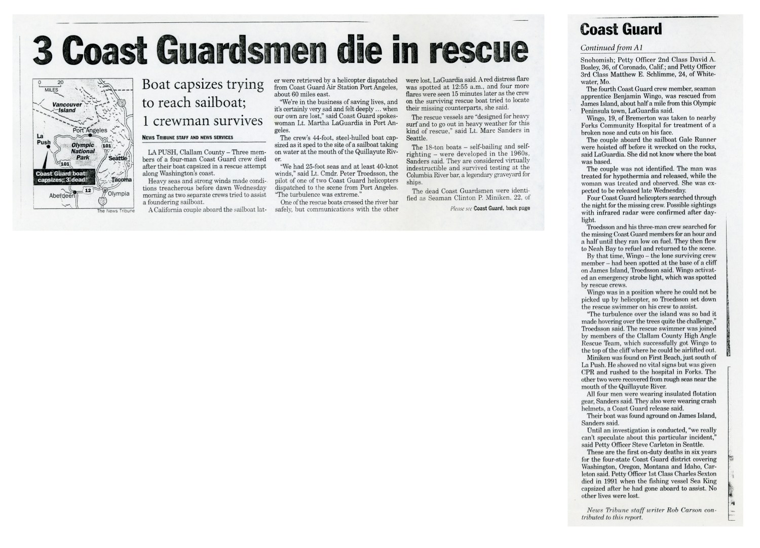 February 1997 Tacoma News Tribune: “3 Coast Guardsmen die in rescue.” Sarah Zurflueh archive