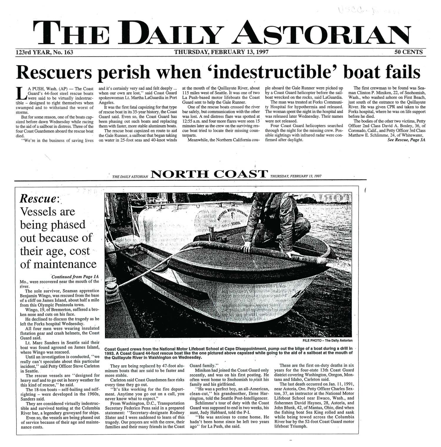 13 February 1997 Daily Astorian: “Rescuers perish when ‘indestructible’ boat fails.” Courtesy of the Columbia River Maritime Museum, Astoria, OR