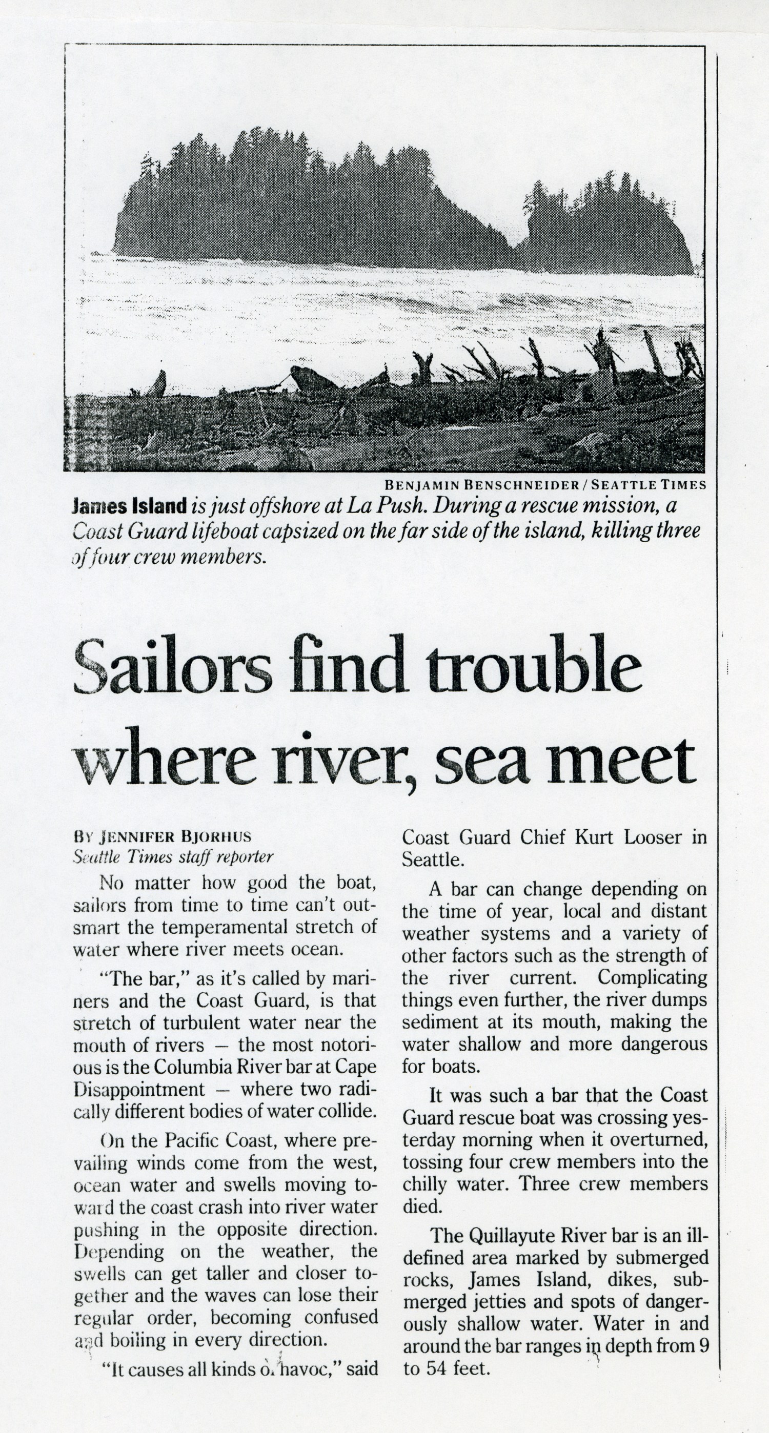 13 February 1997 Seattle Times: “Sailors find trouble where river, sea meet.” Sarah Zurflueh archive