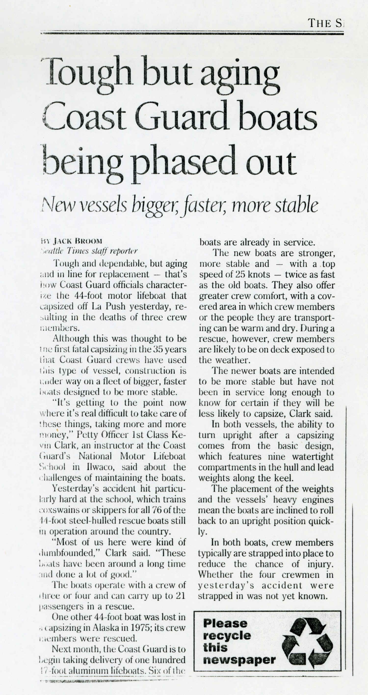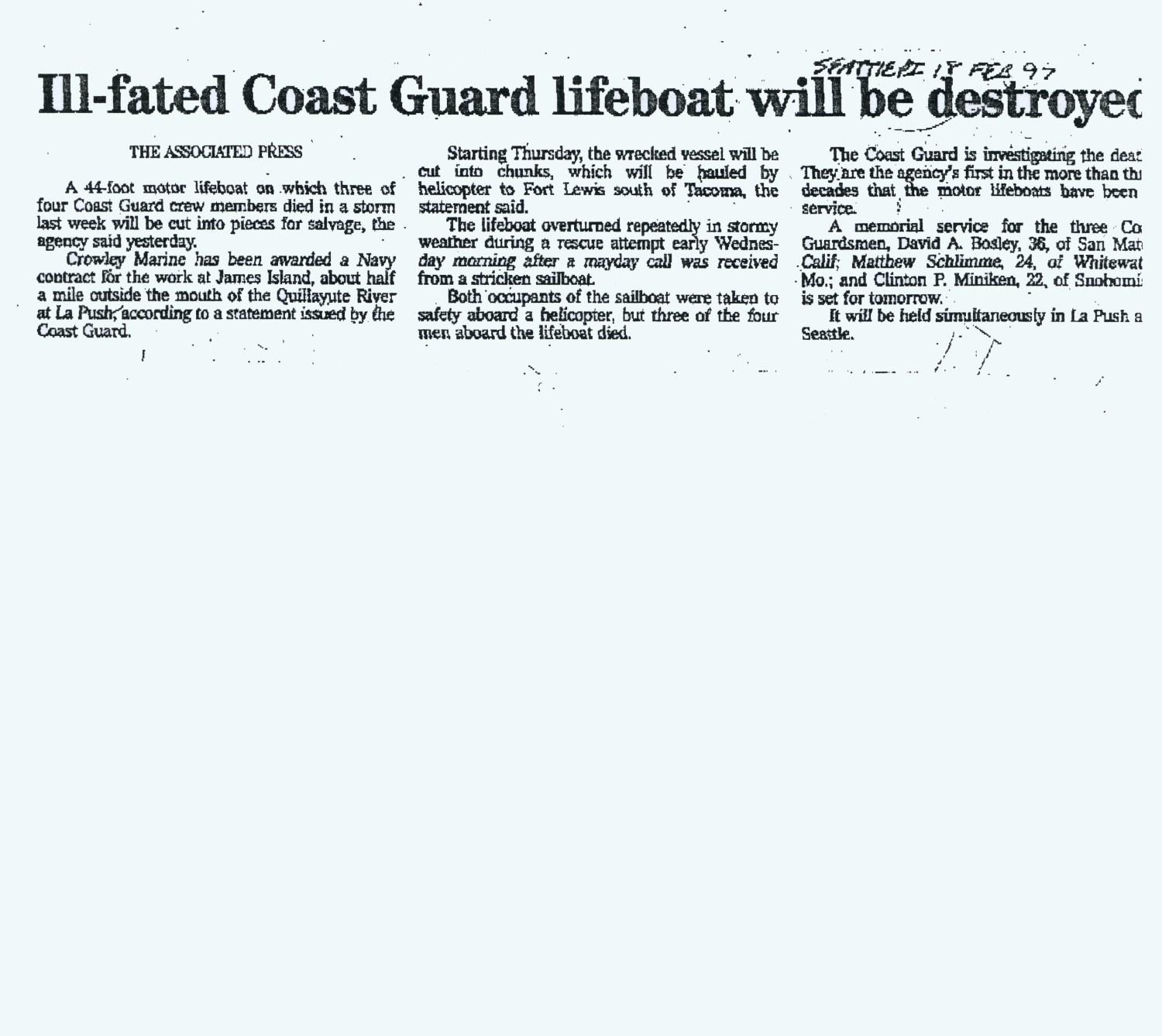 18 February 1997 Seattle Post Intelligencer: “Ill-fated Coast Guard lifeboat will be destroyed.“ Sarah Zurflueh archive