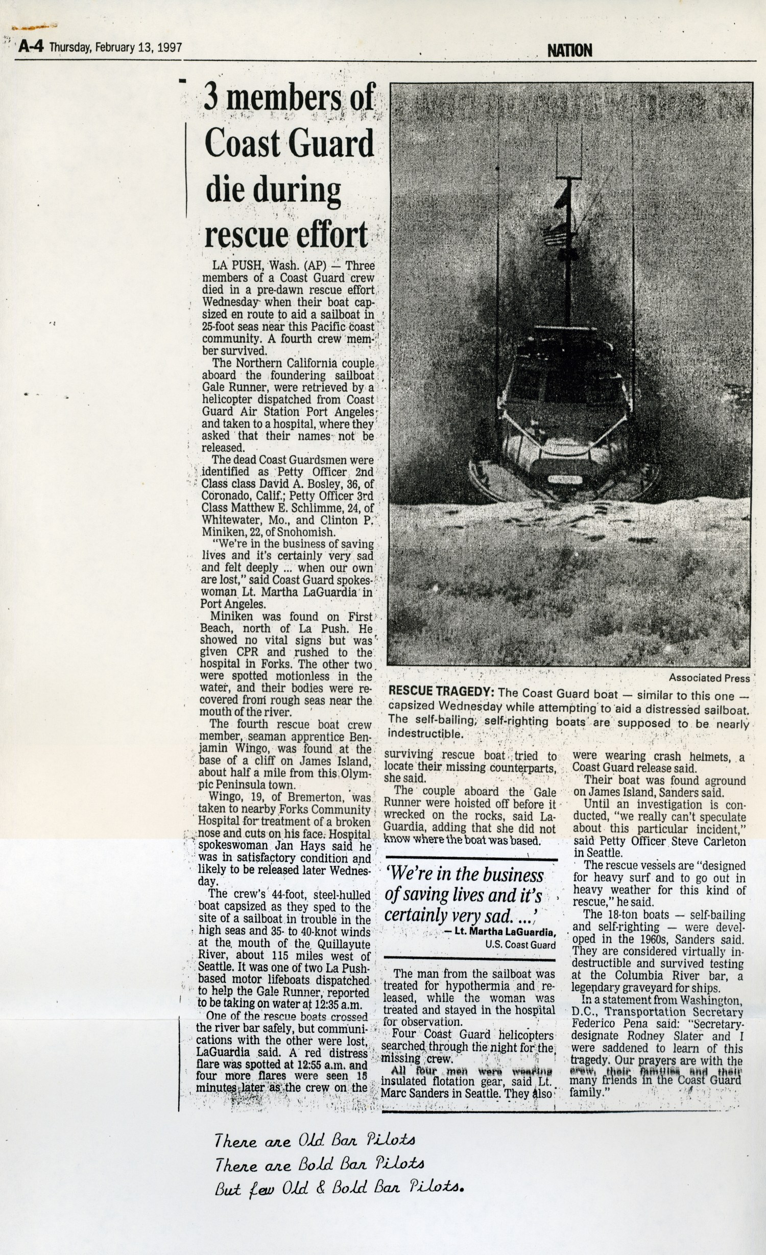 February 1997 AP: “3 Coast Guard members die during rescue effort.” Sarah Zurflueh archive