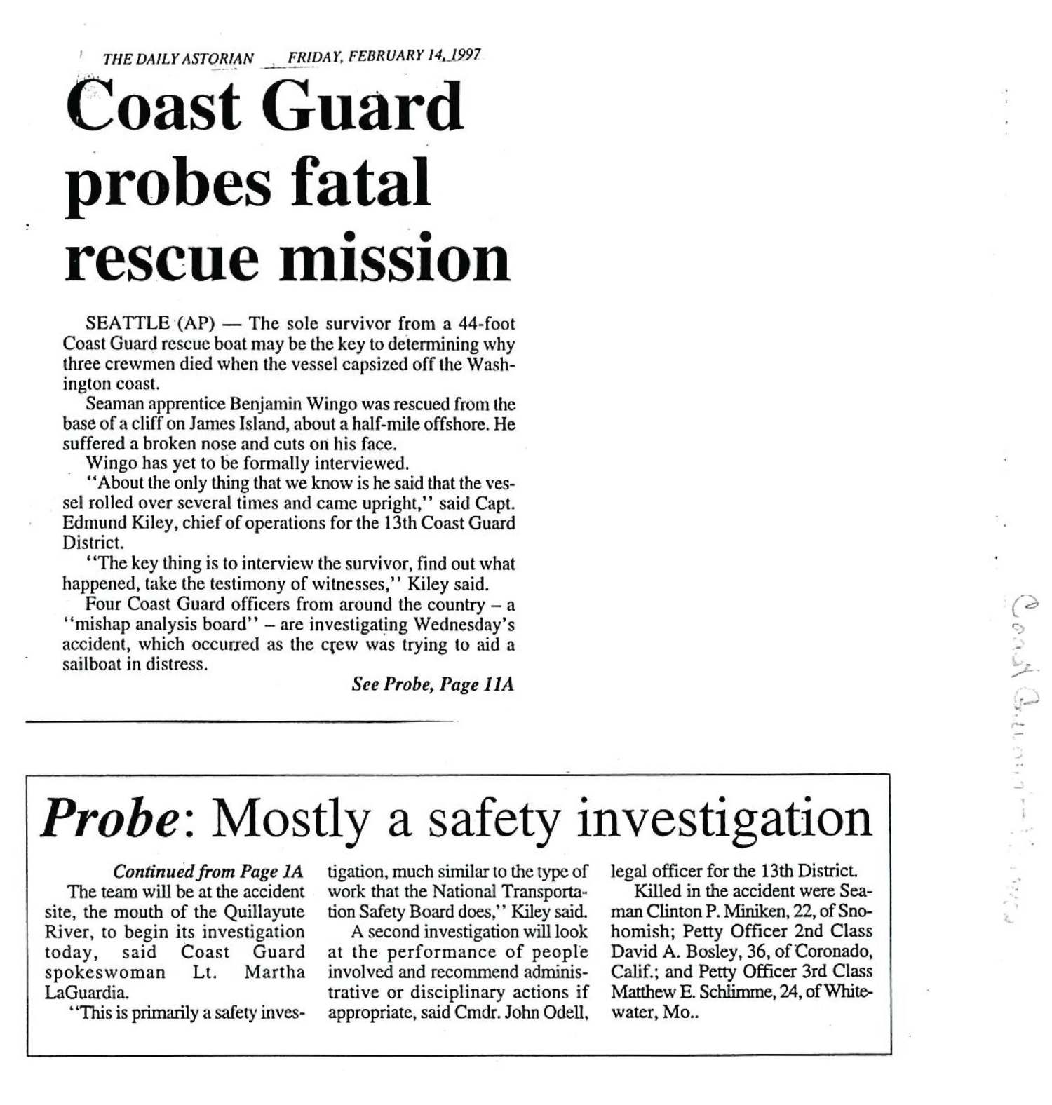 14 February 1997 Daily Astorian: “Coast Guard probes fatal rescue mission.” Courtesy of the Columbia River Maritime Museum, Astoria, OR