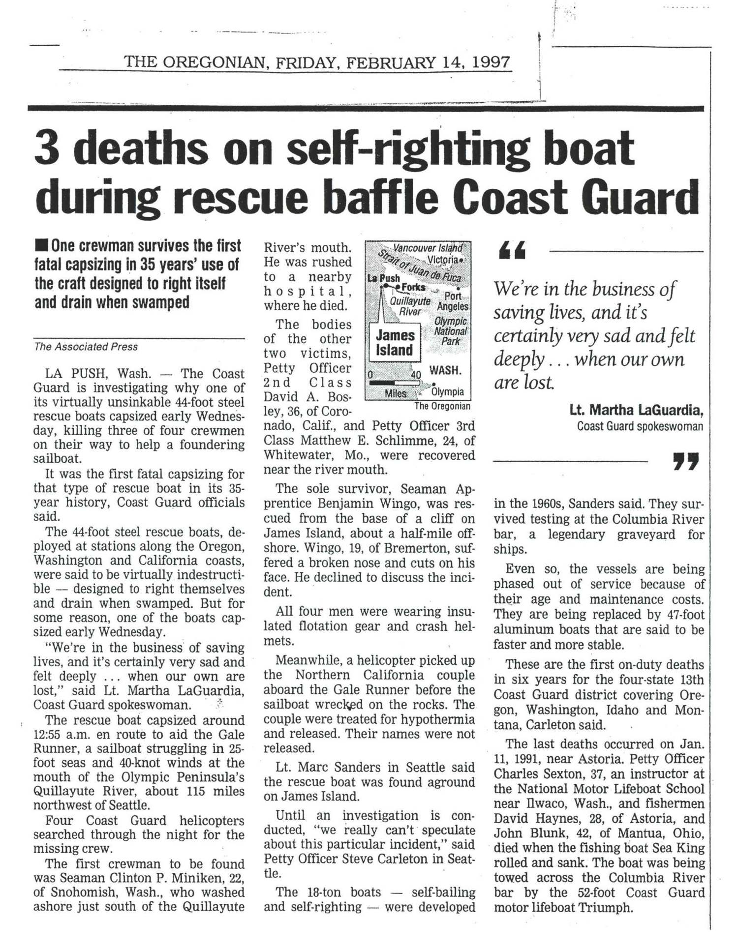 14 February 1997 Oregonian: “3 deaths on self-righting boat during rescue baffle Coast Guard.” Courtesy of the Columbia River Maritime Museum, Astoria, OR
