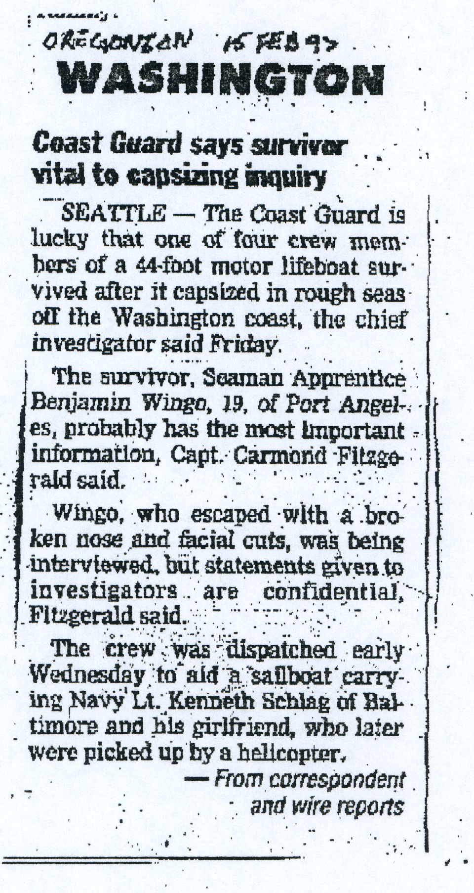 15 February 1997 Oregonian: “Coast Guard says survivor vital to capsizing inquiry.” Sarah Zurflueh archive