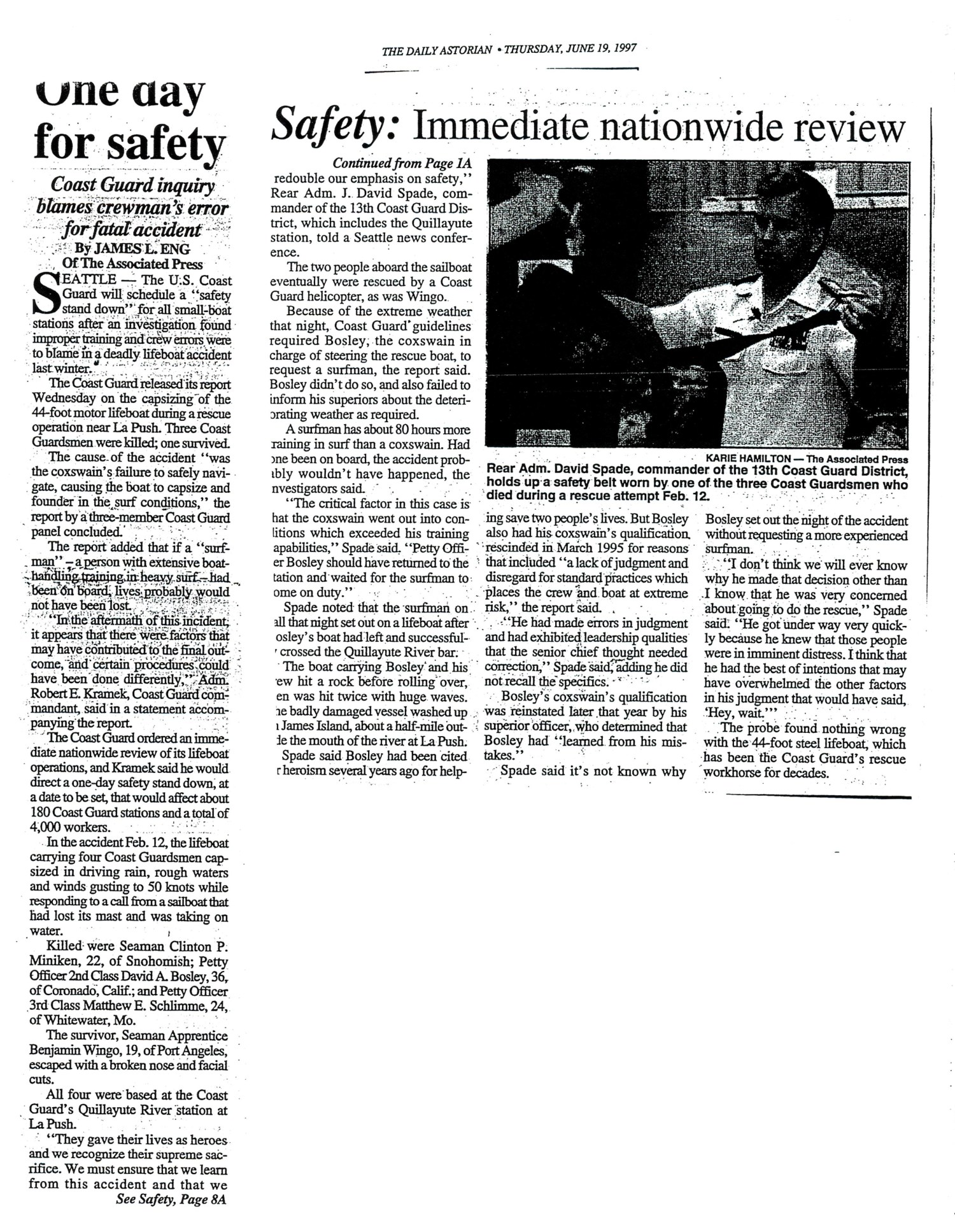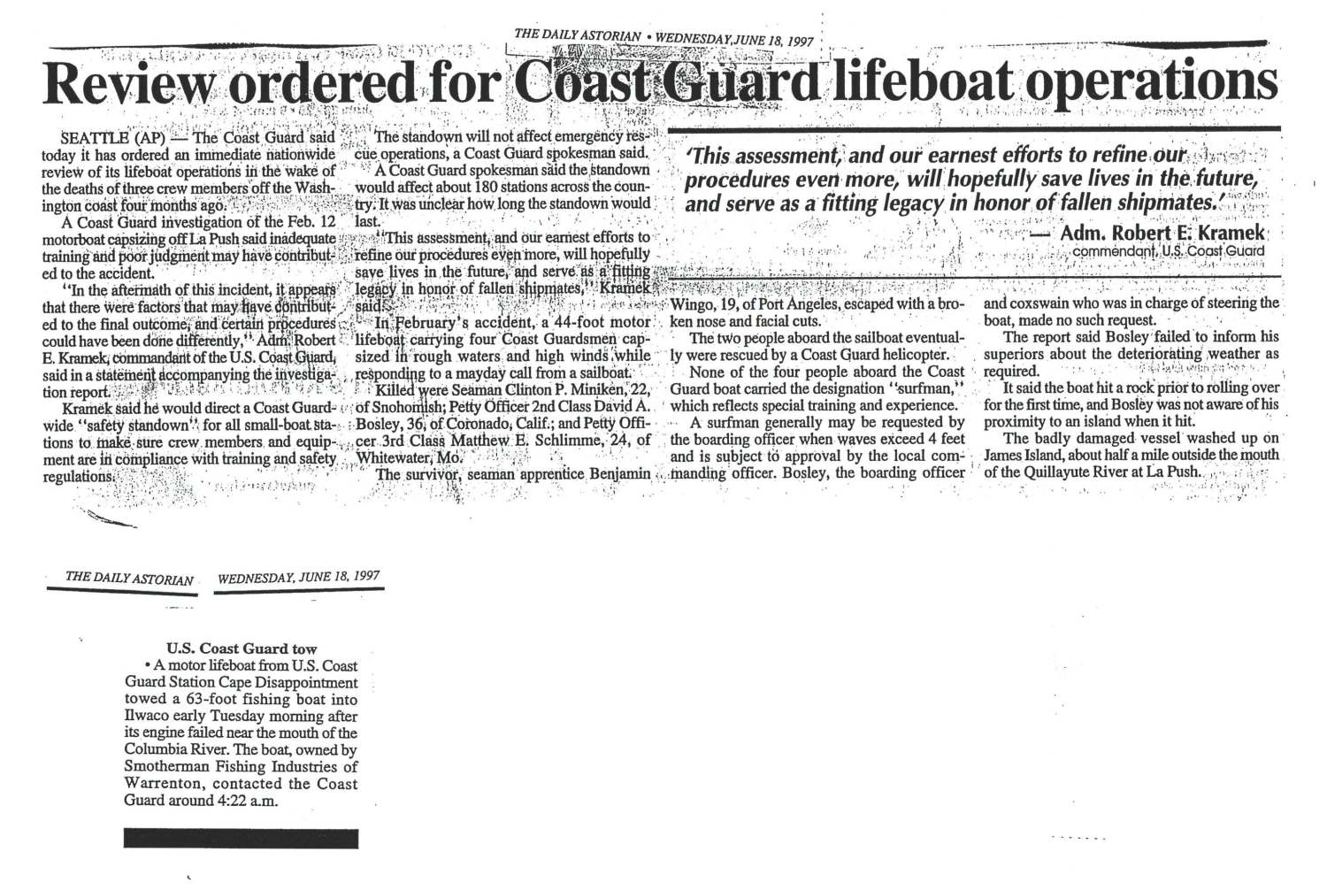 18 June 1997 Daily Astorian: “Review ordered for Coast Guard lifeboat operations.” Courtesy of the Columbia River Maritime Museum, Astoria, OR
