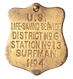 These checks were stamped with the Life-Saving Service district, station number, and individual Surfman number. Later on, or where distance precluded meeting, Surfmen used punch clocks to record their rounds on the beach. Today’s Surfmen are issued a replica check with their unique number engraved on its back. (1)(2)(4)(12)(13)