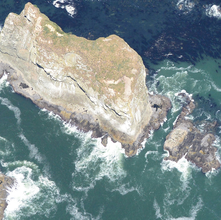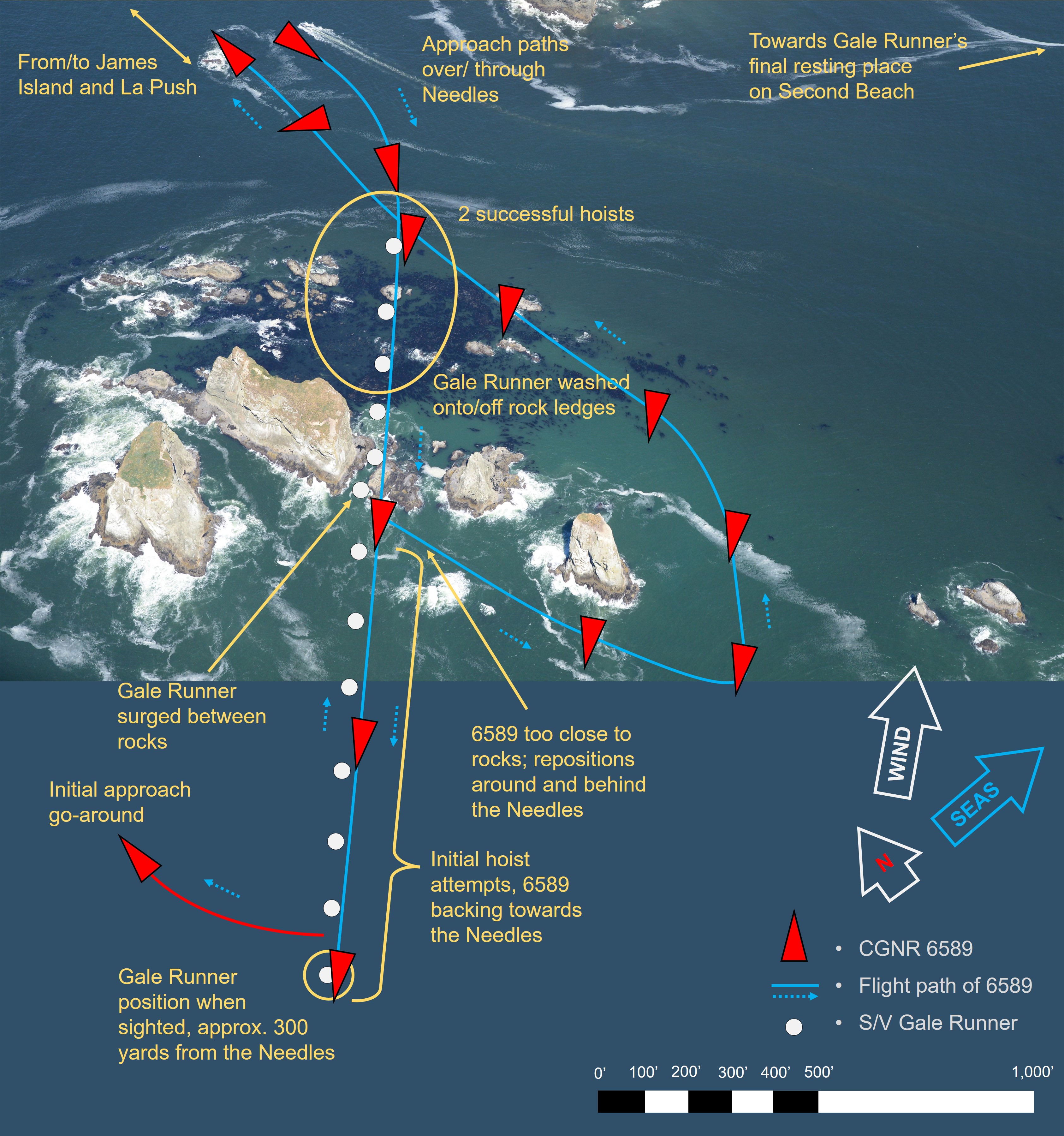 The crew eventually deemed the helicopter’s position to be too close to the Needles, notified the GALE RUNNER that they needed to cease hosting efforts and reposition away from the rocks, and advised the two persons on board to go below and prepare for impact. Shortly after passing this instruction, the air crew observed a wave swallow the sailing vessel and surge it into and through the narrow gap between one of the largest Needles (Cakesota) and an adjacent pinnacle. (3)(4)