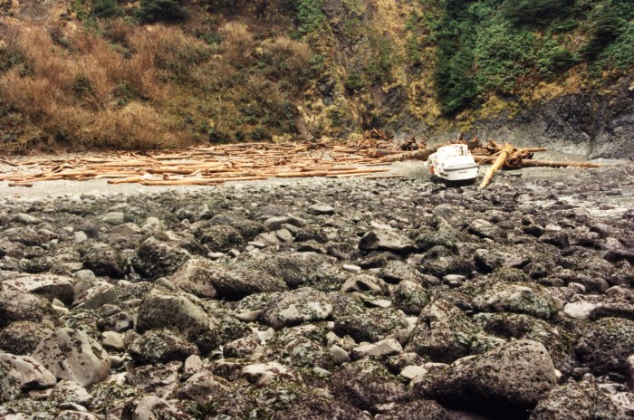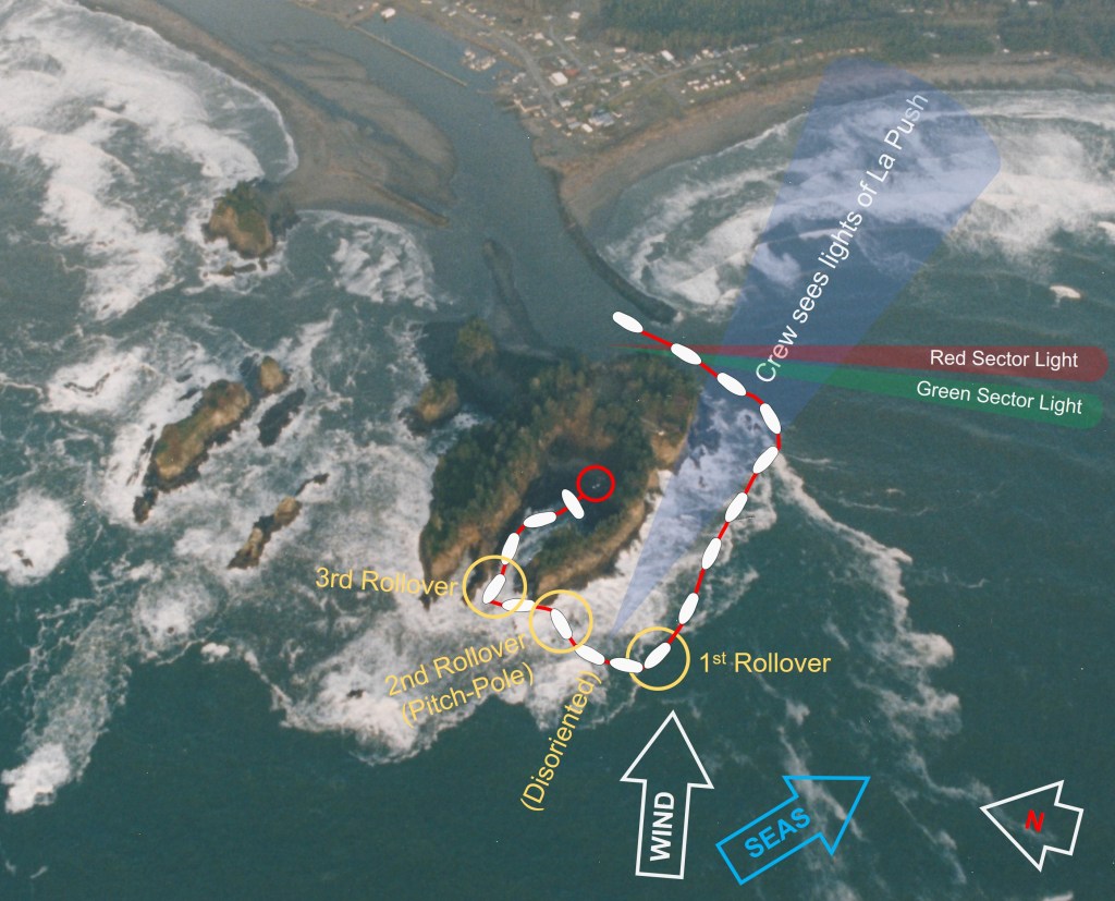 The image below depicts the approximate path and orientation of CG 44363 after leaving the protection of the Quillayute River. CG 44363 had been underway for approximately 14 minutes at the time of the first rollover. When SA Wingo looked at his watch after the third rollover, CG 44363 had been underway for 33 minutes. It soon came to rest at the back of the cove on James Island. (1)(2)(3)(4)